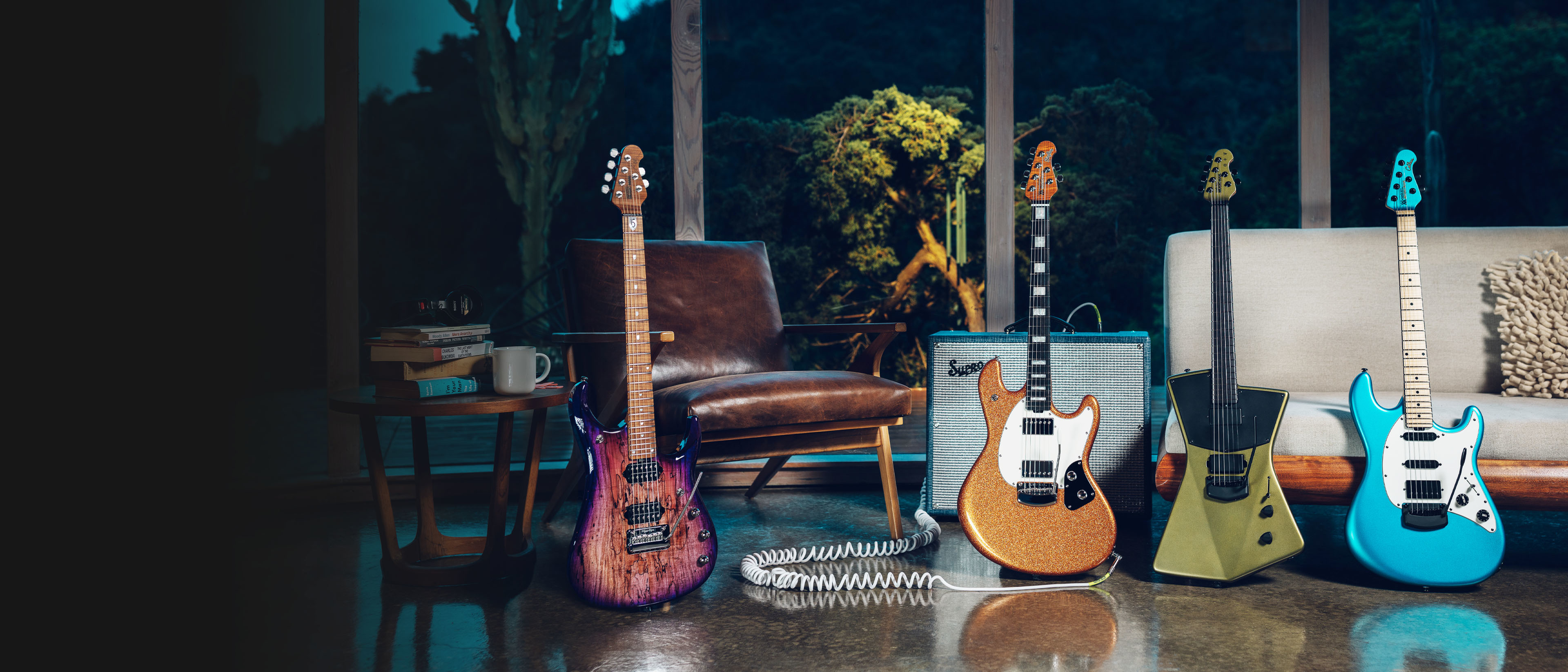 Questo mese presentiamo la chitarra John Petrucci 15 in Purple Sunset, la chitarra StingRay in Atomic Orange, la St. Vincent HH in Dargie Green III e la Cutlass in Blue Magic.